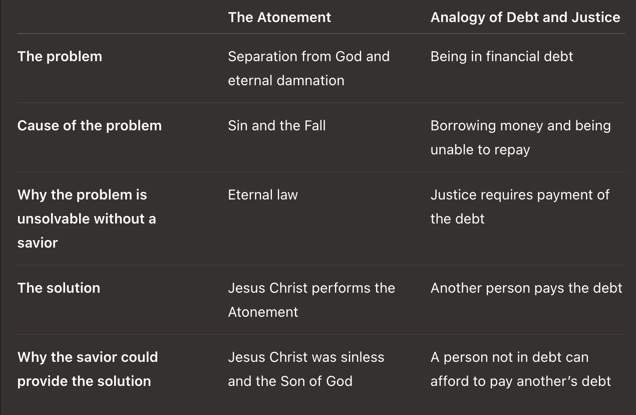 To help clarify, this table maps the same concept across the Atonement and this analogy of debt and justice: